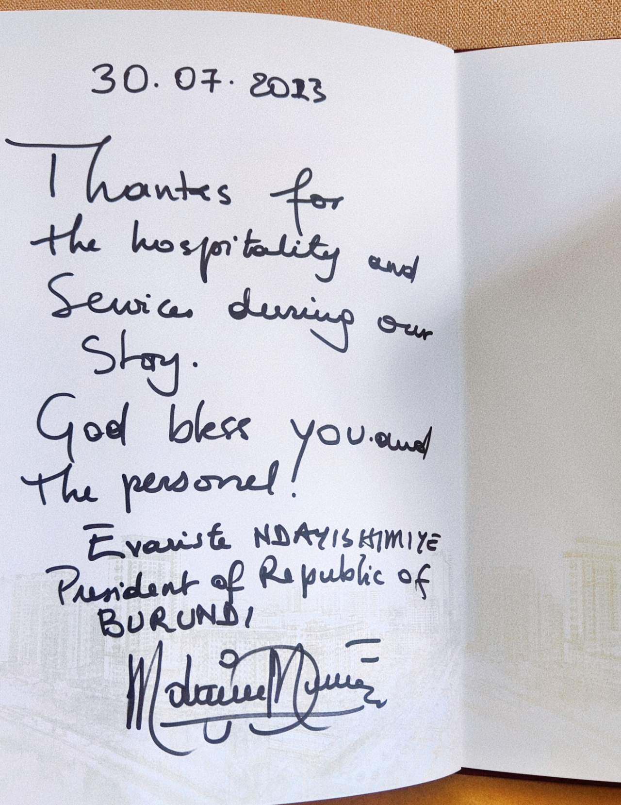 國家領(lǐng)導(dǎo)人及夫人離館之際,在金牛賓館親切問候了賓館以黨科同志為代表的服務(wù)保障團隊成員,表達(dá)了對川菜的喜愛,夸贊川菜“巴適”,并表示在金牛賓館可以享用到正宗的川菜,稱贊金牛賓館是有傳統(tǒng)的賓館。布隆迪總統(tǒng)恩達(dá)伊施米耶在錦江賓館留言簿上留言,表示了對錦江賓館此次接待的感謝,并與接待人員合影留念。