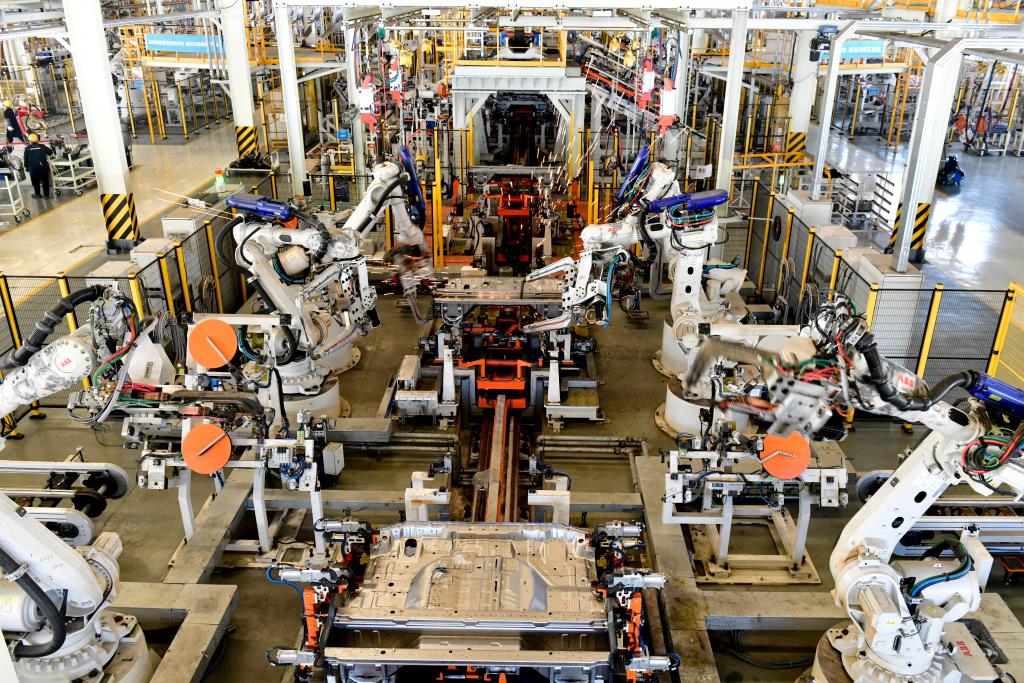 1月9日,在位于日照市五蓮縣的五征集團(tuán)汽車(chē)焊裝車(chē)間,工業(yè)機(jī)器人在焊裝車(chē)身。新華社記者郭緒雷攝